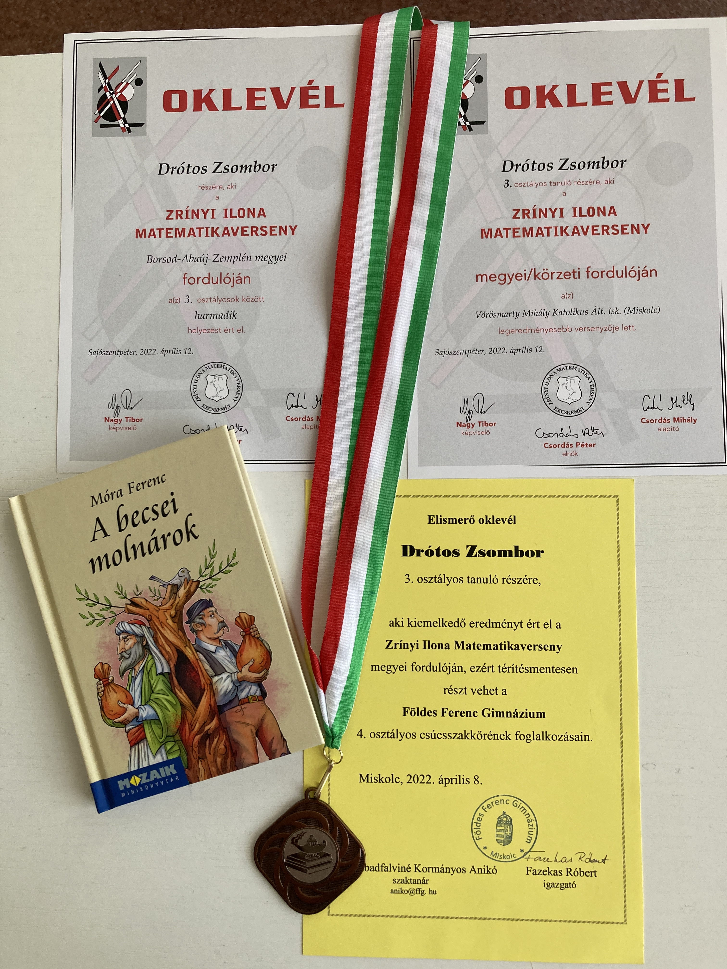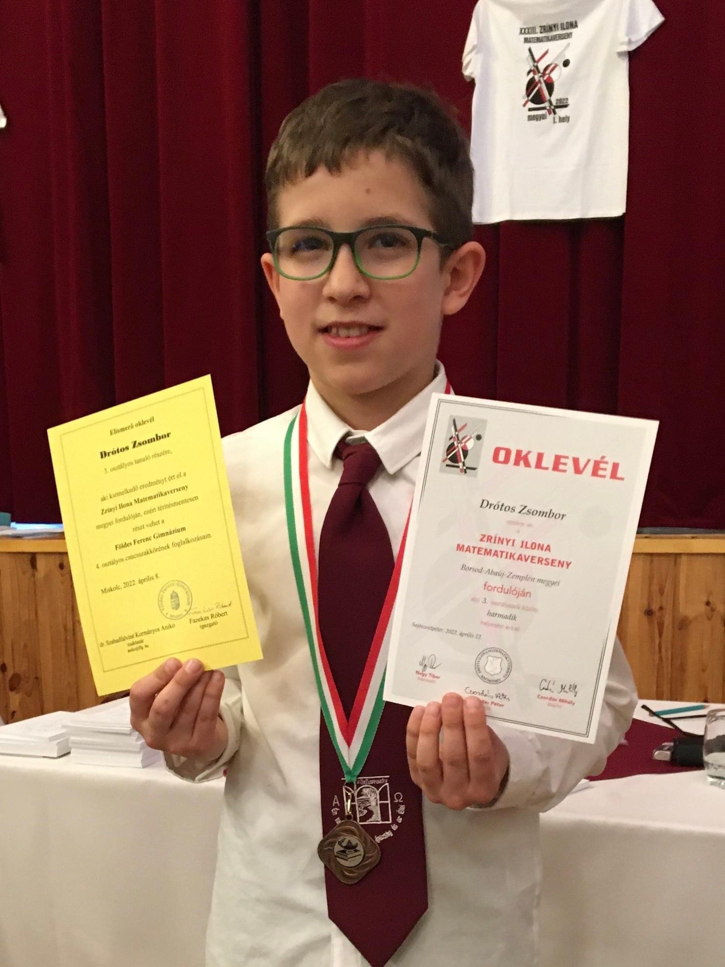 Drótos Zsombor 3.a osztályos tanuló a Zrínyi Ilona Matematikaverseny megyei fordulóján harmadik helyezést ért el.