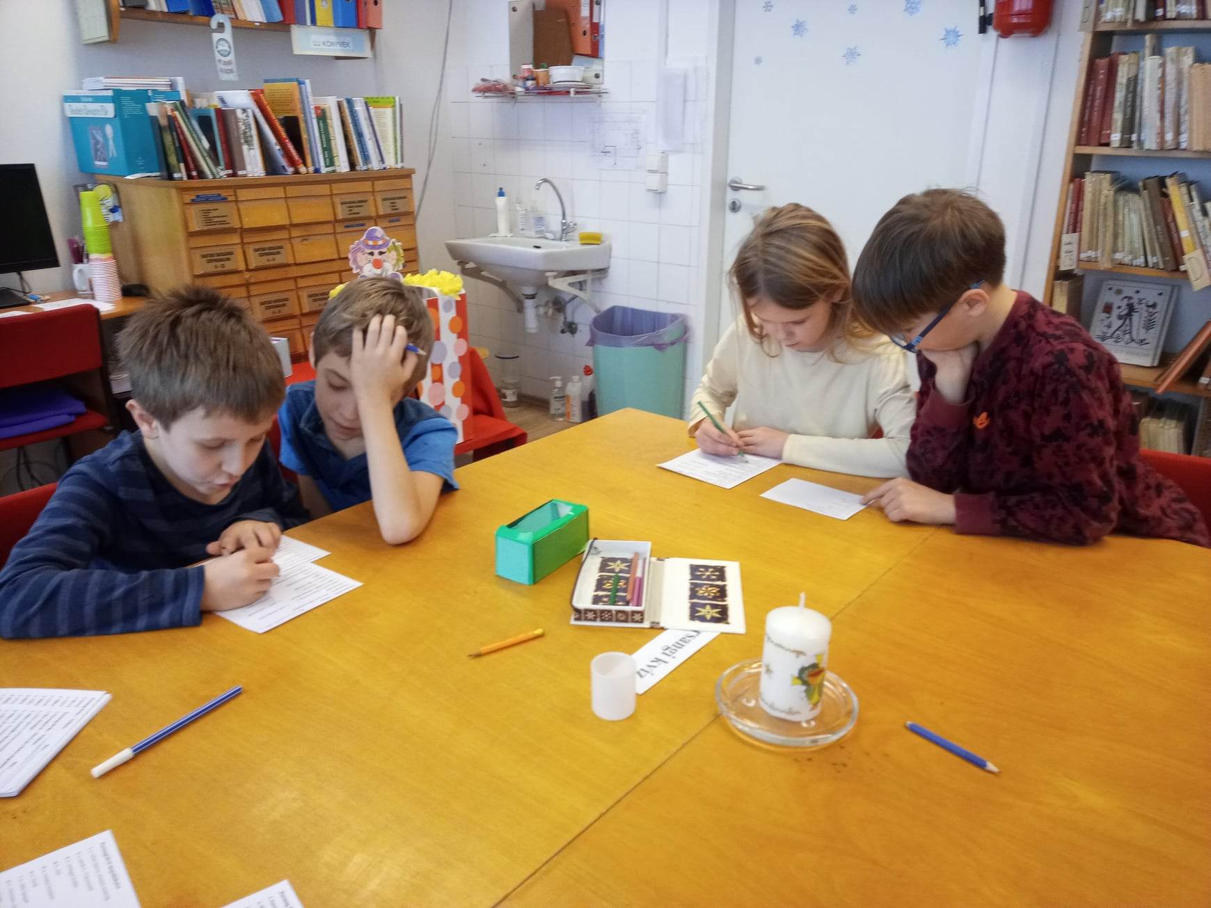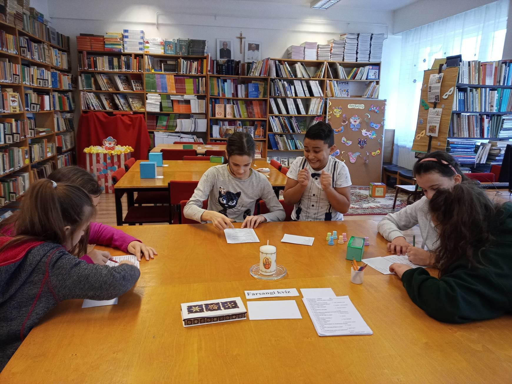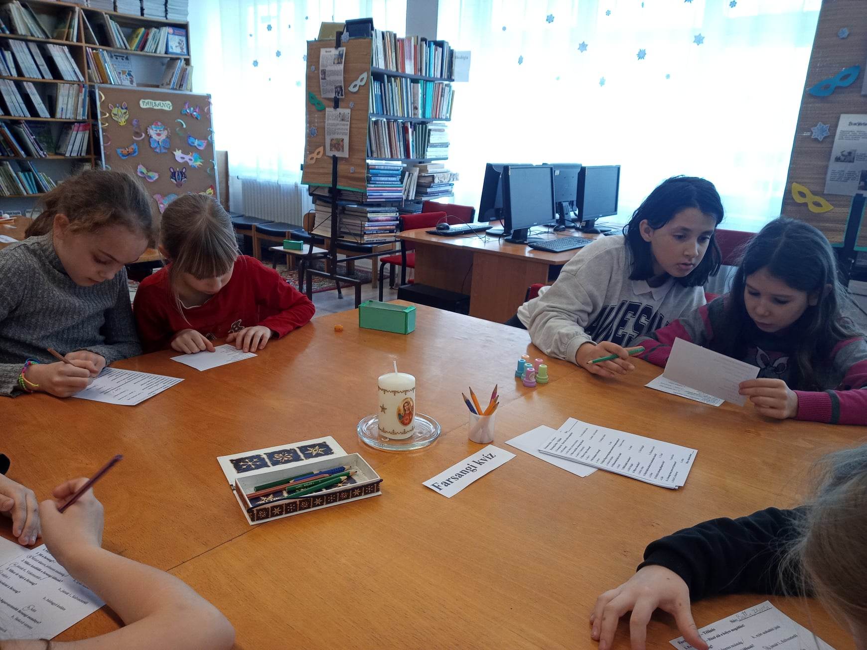 „Farsang farka" téltemető, tavaszváró foglalkozáson vettek részt a 3.a, 3.b és 4.b osztályok tanulói az iskola könyvtárában. A télűzéshez szükség volt a farsangi szokások, hagyományok ismeretére. A kvízkérdések megoldásához, az állomások játékos feladataihoz pedig az ügyességükre.