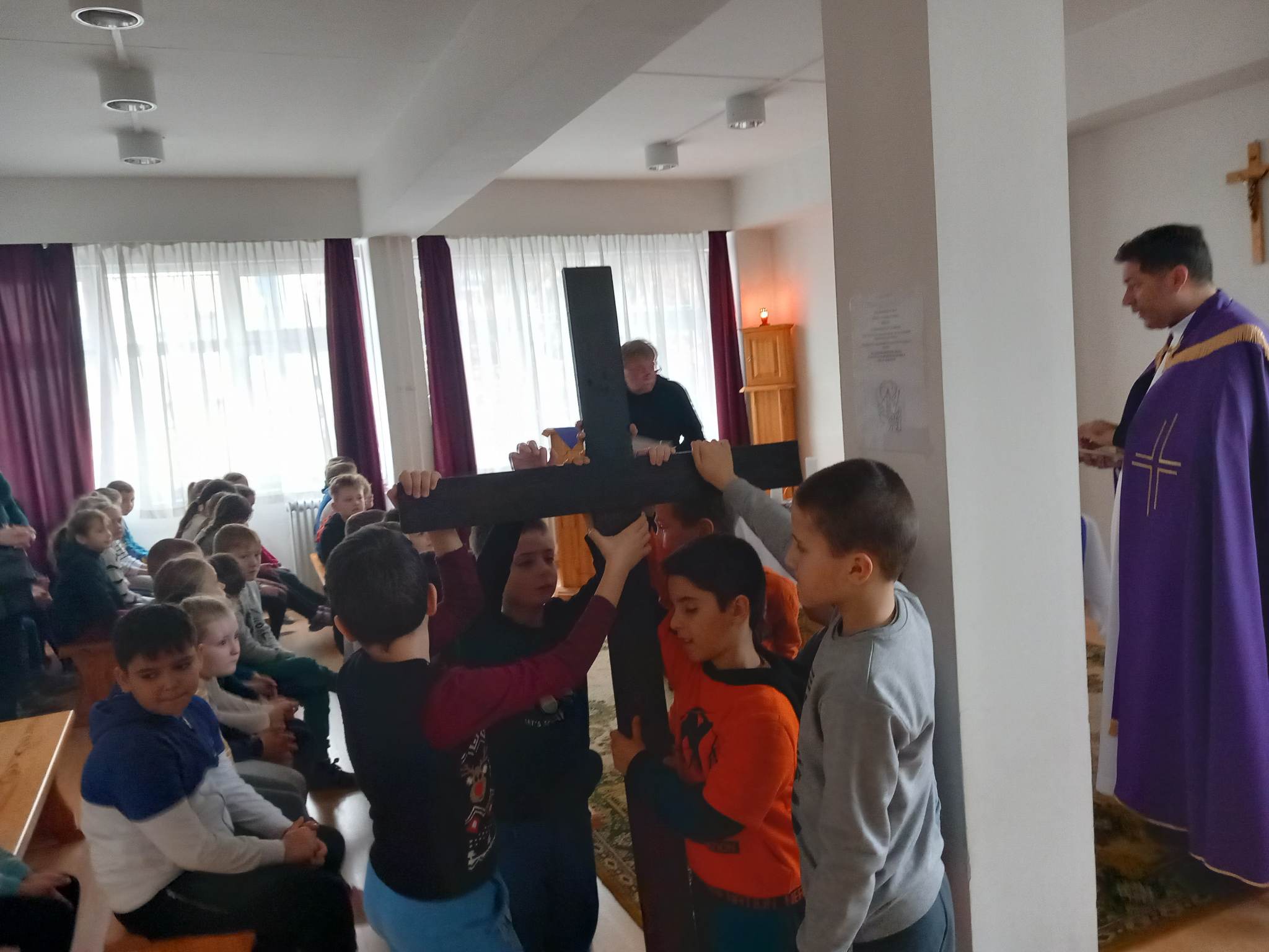 Az idei év első nagyböjti péntekén Thiago atya vezetésével, Csík Tibor igazgató úr, Hegedűsné Veréb Anita hitoktató és a helyettesítő osztályfőnökök közreműködésével az elsősök és a másodikosok imádkozták végig a keresztút állomásait: "Imádunk Téged, Krisztus, és áldunk Téged, mert szent kereszted által megváltottad a világot."