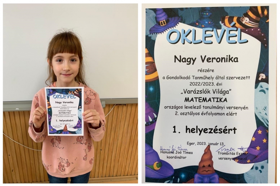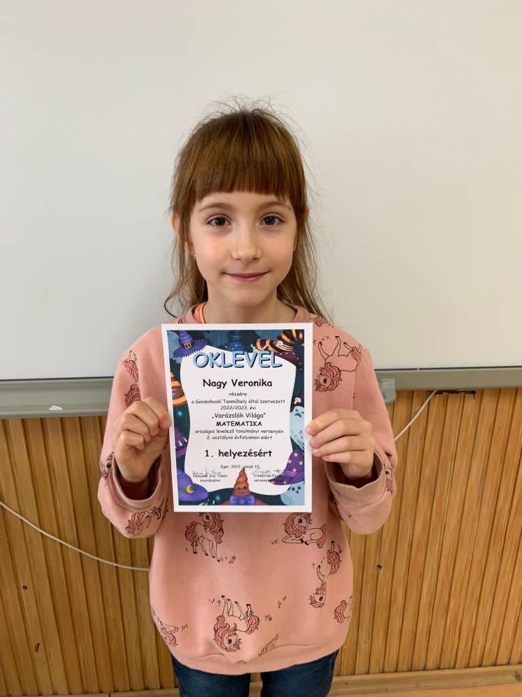 Nagy Veronika 2.a osztályos tanuló a Gondolkodó Tanműhely által szervezett országos levelező matematika versenyen 1. helyezést ért el.