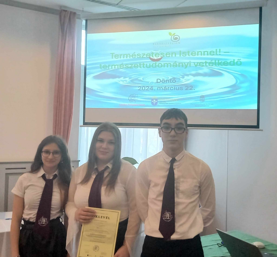 A Természetesen Istennel országos természettudományi vetélkedőn a 8.a osztály csapata képviselte iskolánkat. A résztvevő csapatok vízzel kapcsolatos filmeket készítettek. Iskolánk Zöld Kommandó csapatának „Honnan kerül a víz a csapba Miskolcon?” című filmje a három legjobb alkotás közé került és a zsűri különdíjjal jutalmazta. Gratulálunk!