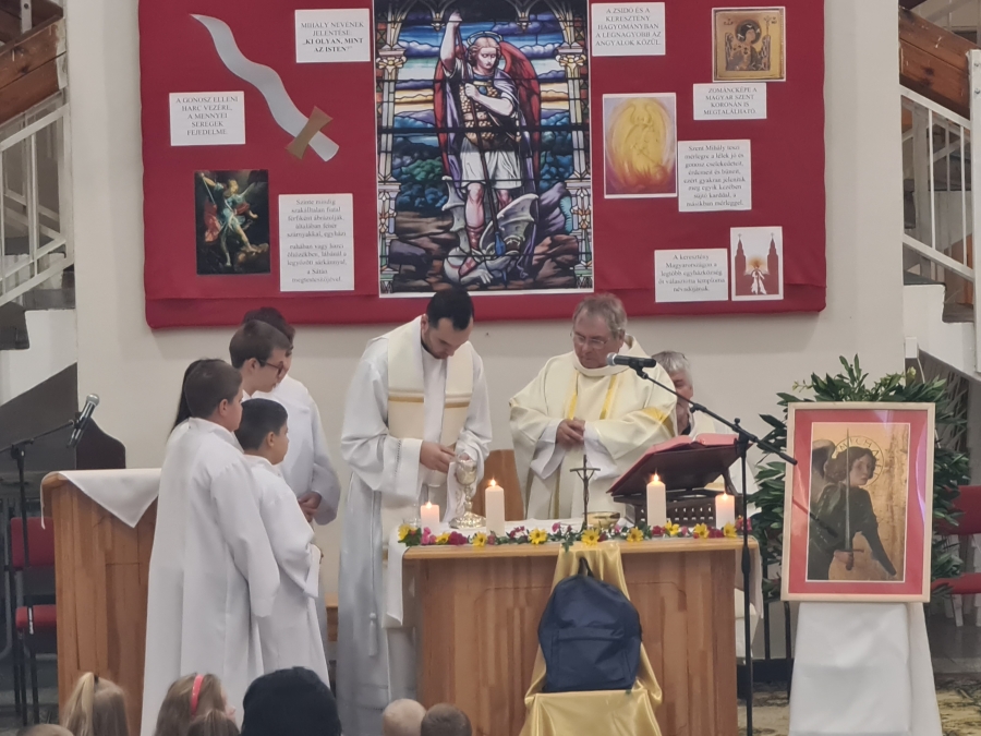 Ilyen védangyal iskolánk és óvodánk számára Szent Mihály. A védelem jelképével, vagyis a karddal a kezében ábrázolja Őt az aula falára helyezett kép. Van tehát védőszentünk, imádkozhatunk hozzá: "Szent Mihály arkangyal, védelmezz minket a küzdelemben..."
