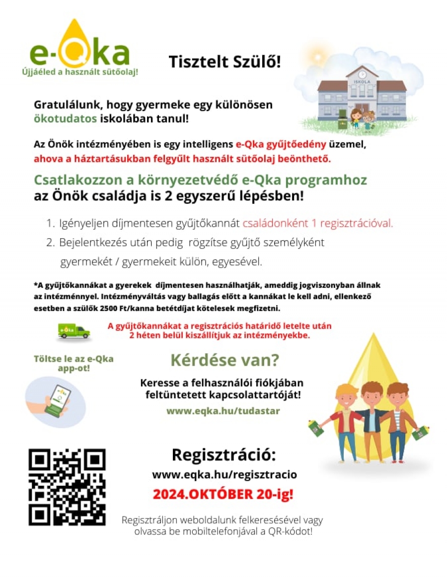 Iskolánk továbbra is fontosnak tartja a környezetvédelmet. Ennek érdekében, a e-Qka programhoz csatlakozva használtsütőolaj-gyűjtőedény került kihelyezésre az intézményben. A program célja, hogy a felgyülemlett, használt sütőolajat biztonságos módon, szelektíven gyűjtsük. A kezdeményezés ebben a tanévben is folytatódik, ám a csatlakozás regisztrációhoz kötött. Ezt követően a tanuló megkapja a névre szóló olajgyűjő kannáját, amelyet használva ő és családja is segíthet a környezete megóvásában.