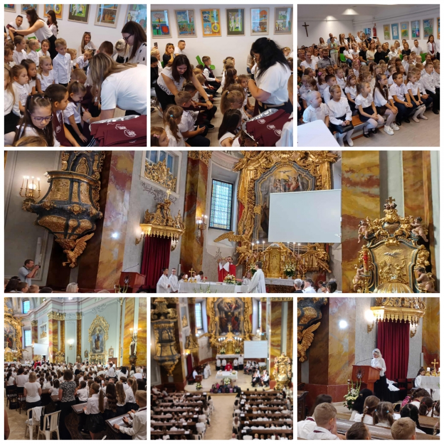 Kilenc órától az alsósok és a felsősök Veni Sanctén vettek részt a Mindszenti-templomban. Főtisztelendő Szedmák Zoltán káplán atya mutatta be a tanévindító szentmisét, megáldotta a jelenlévő gyermekeket és pedagógusokat, homíliájában pedig kiemelte a szeretet fontosságát, amelyre tanévünket és mindennapjainkat is építhetjük. A szentmise végén nem maradt el a tanszerek megáldása sem, ezt követően Tóthné Rimaszécsi Zsuzsanna főigazgató asszony Dr. Ternyák Csaba érsek atya mottójával nyitotta meg az új tanévet: "Legyetek a Remény zarándokai!" Tanévnyitó beszédében kiemelte a szeretet és a hit fontosságát, melyekre az iskolán belül és kívül is bizalommal és biztonsággal építhetjük életünket.