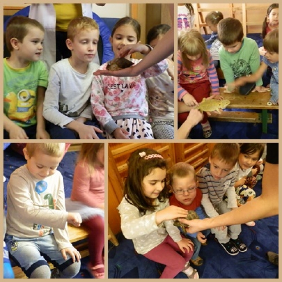 Az Állatok Világnapja alkalmából meglátogattak bennünket a Miskolci Állatkert és Kultúrpark munkatársai. Különleges vendégeket is hoztak magukkal: botsáskát, kaméleont, teknőst, vadászgörényt… Meg lehetett érinteni, simogatni őket. Foghattak a gyerekek a kezükbe teknőstojást, levedlett kígyóbőrt, koponyákat. Sok új ismerettel gyarapodtak az óvodások. Nagy élmény volt ez a délelőtt a számukra.
