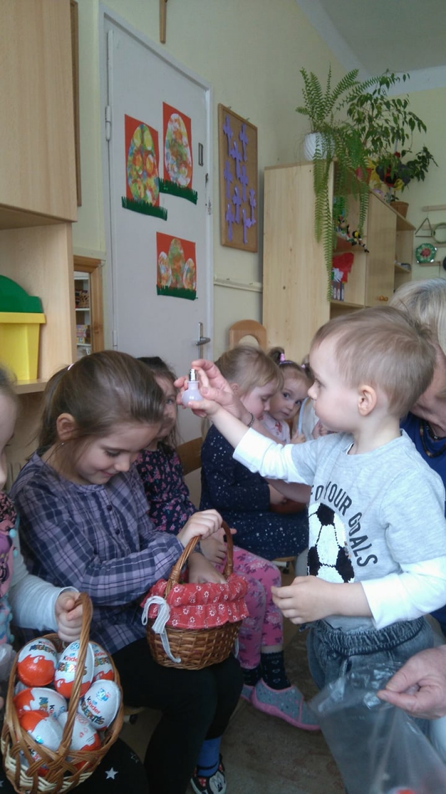 A locsolkodás szép hagyományát mi is ápoljuk az óvodában. Idén is gondoskodtak róla a kisfiúk, hogy el ne hervadjanak a kislányok. Csoki tojás volt az öntözőlegénykék jutalma versükért és a szagos vízért.