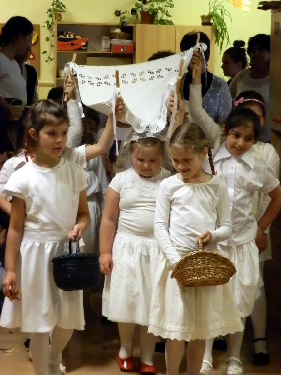 Idén a változékony idő miatt nem pünkösdölhettünk a szabadban. A kevesebb hely azonban nem szegte senki kedvét: a kis királylányt most is körbehordozták a nagyobb kislányok; a kisfiúk árkot ugrottak a pünkösdi király címért; a táncházban pedig mindenki alaposan kimulatta magát.