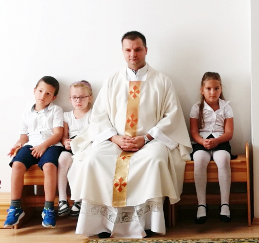 Az iskola kápolnájában tartott tanévnyitó szentmisét Kovács József atya. Idei első szentmisénken a Katica és az Őzike csoportos gyerekek vettek részt. Józsi atya kedves szavaival a szentek életét állította példaként elénk; majd végezetül a Jóisten áldását kérte az óvodások és a velük foglalkozó felnőttek egész évi közös munkájára.
