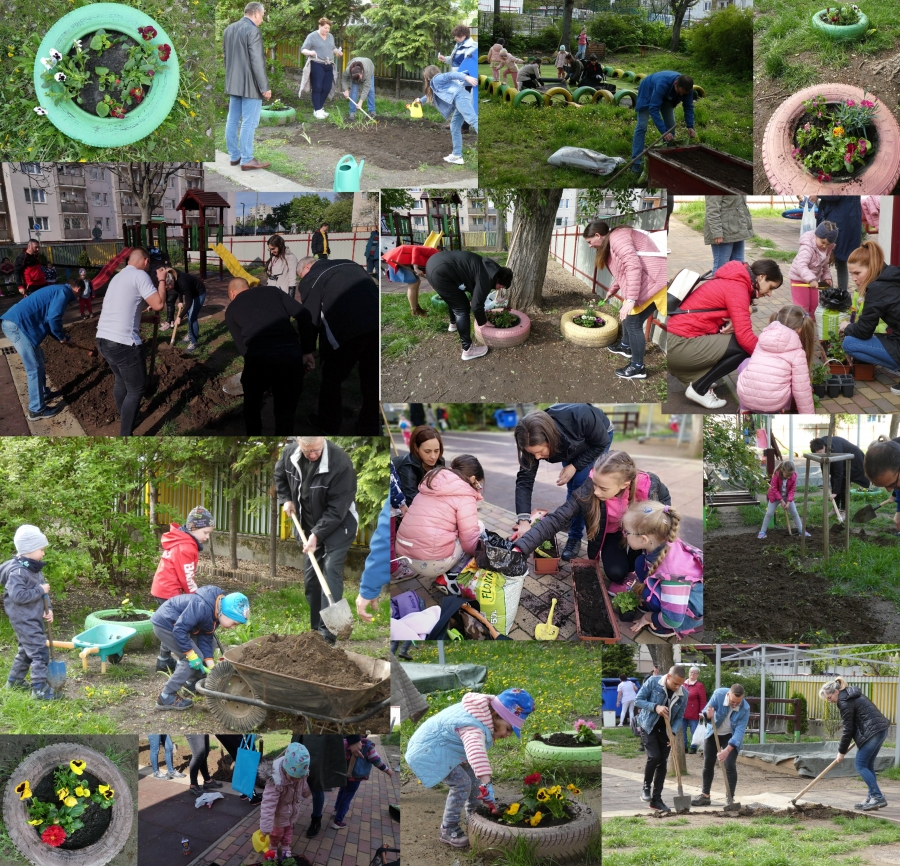 Kicsinyek és nagyok közösen rendezgettük, szépítgettük az óvoda udvarát. Ástunk, gereblyéztünk, talicskáztunk; virágokat palántáztunk és füvesítettünk is egy kicsit. Most már csak szorgalmasan locsolnunk kell, meg a napocskának énekelni, hogy tegye ő is a dolgát.