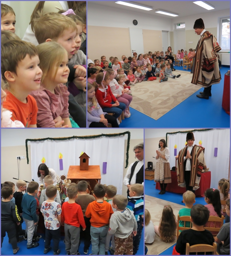 Kapusi Szabolcs bábszínész és Sinka Tímea múzeumpedagógus varázslatos betlehemes bábműsorral örvendeztettek meg minket. A kis Jézus születésének története gyönyörű népdalok, kellemes citeraszó és sok – sok nevetés közt elevenedett fel előadásuk során. A műsor végén a gyerekek közelről is megcsodálhatták a szépséges, hagyományos betlehemet és a terménybábokat.